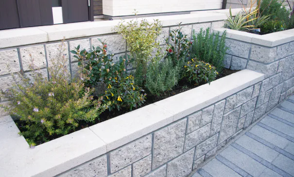 ヘルムをブロック塀の笠木として使用した施工例です。やさしい色合いが空間に柔らかな印象を与え、塀まわりをすっきりとまとめています。シンプルな形状のため下部のブロックデザインを邪魔せず、全体の表情を引き立てます。