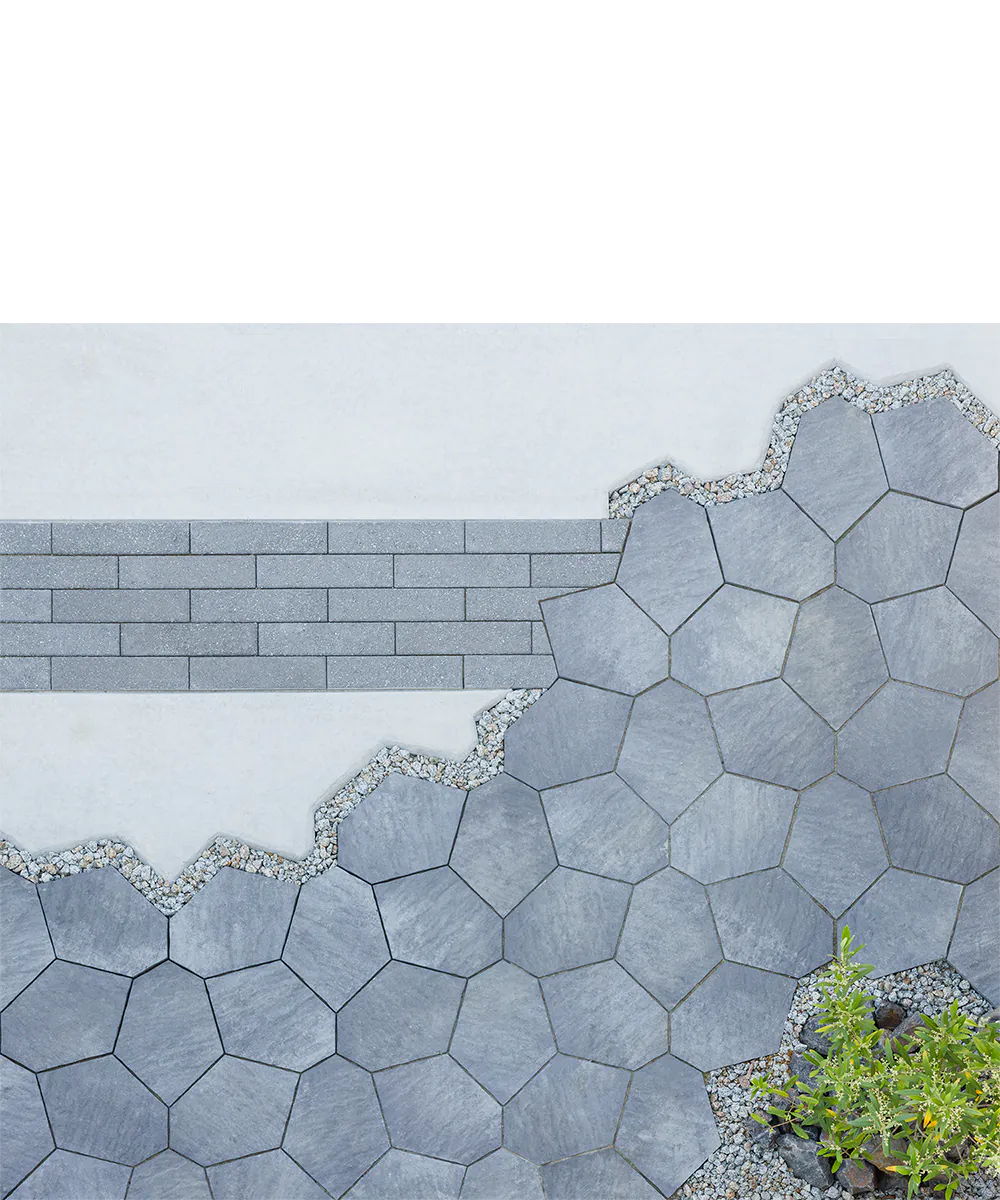 フローは独自形状で流れるような石調舗装を描くインターロッキングブロック。